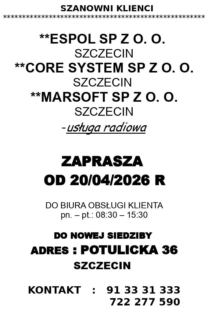 Szanowni klienci, informujemy że biuro obsługi klienta i infolinia w dniu 31.12.2025 będą czynne w godzinach od 8:30 do 13:00